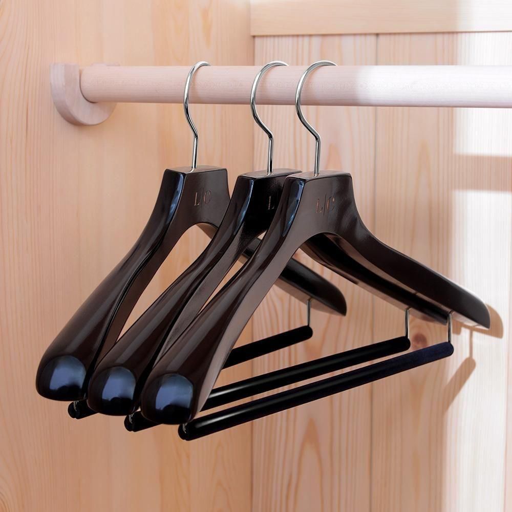 ハンガーは服の形崩れを防ぐとともに、着用によりついたシワを伸ばし、汗などの水分を蒸発させ服をリフレッシュさせるとても重要な道具です。LC ハンガーは、服に負担をかけない緩やかな曲線、肩先に厚みをもたせることで、しっかりと服を支えて保管します。オーダースーツ、お気に入りのジャケット、重みのあるジャケットやコートのシルエット維持におすすめ。男女ともに使用できるサイズです。
