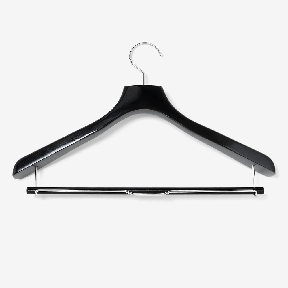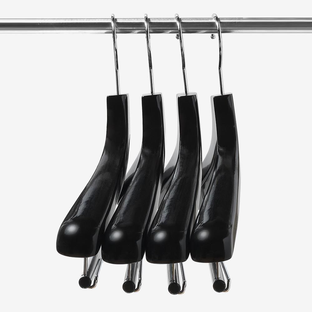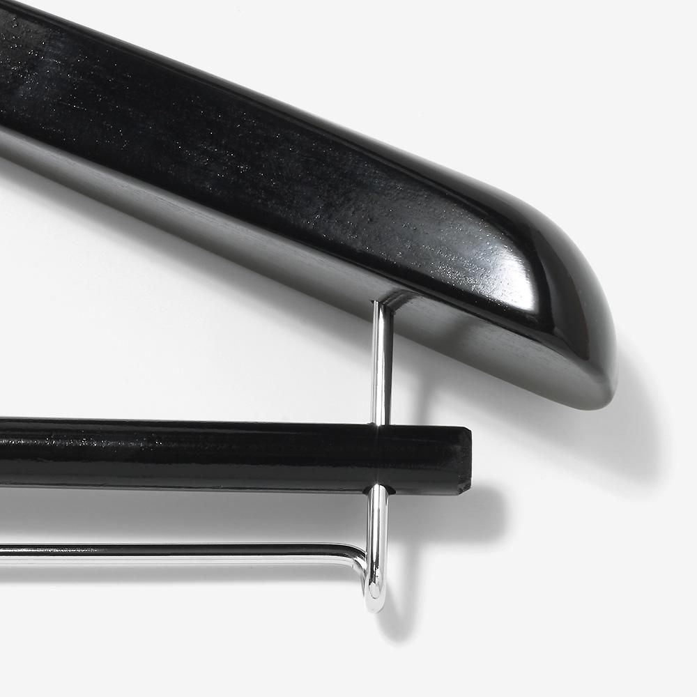 素材には木目が密で衝撃にも強いブナ材を使用し、ツヤのあるブラックの塗装で仕上げています。吸湿性を謳った無塗装のハンガーもありますが、ハンガーに掛けることで空間ができ空気が対流するため、ことさらハンガーに吸湿性を求める必要はありません。むしろ無塗装のハンガーはホコリを吸着するため、使用し続けると汚れが目立つ欠点があります。その点、塗装したハンガーならいつまでも美しく使えます。艶のあるブラックの塗装はしっとりとした優しい質感。程よい重量感も手にするたびに愛着を感じさせてくれます。